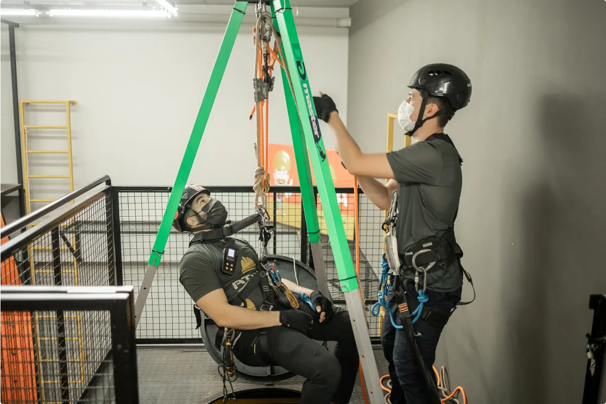 Equipamentos para trabalho de resgate em altura em espaço confinado.